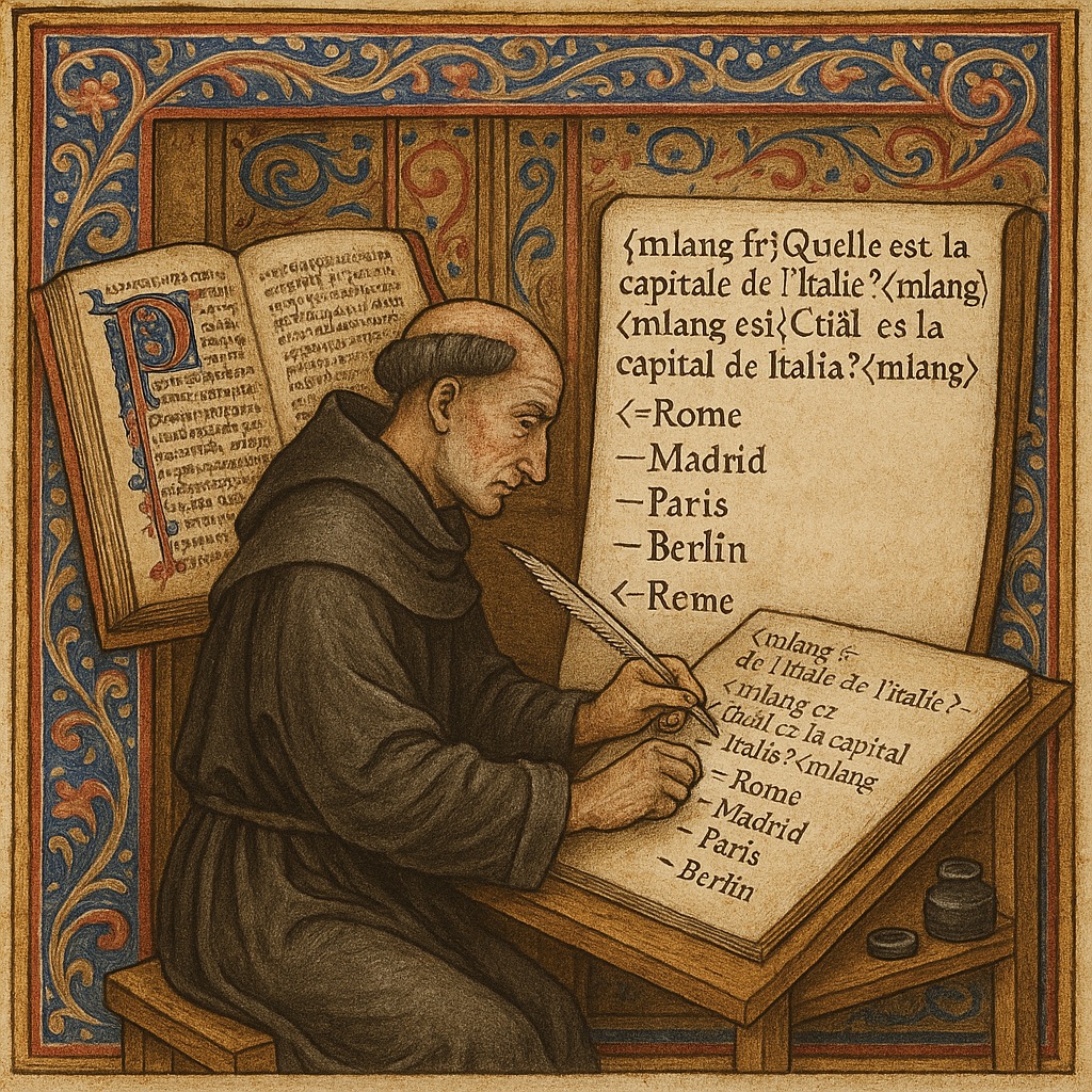 En esta entrada presento IAs que ayudan a insertar etiquetas mlang en cuestionarios para que puedan visualizarse en diferentes idiomas dentro de código GIFT y así exportar masivamente gran cantidad de preguntas a Moodle.